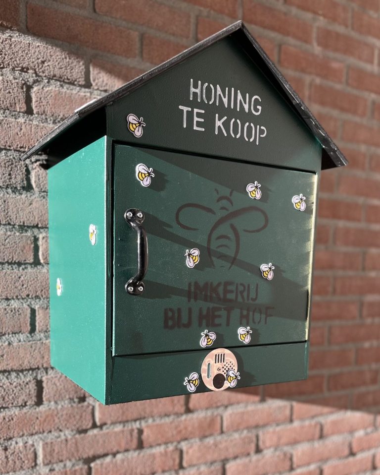 Voor ons huis staat een verkoopkastje met verse honing uit eigen bijenstal.